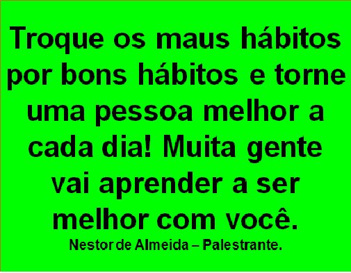CONSELHO DO DIA 15/11/2017 Troque os maus hábitos por bons hábitos e torne uma pessoa melhor a cada dia! Muita gente vai aprender a ser melhor com você. Nestor de Almeida. By Nestor de Almeida | 15 de novembro de 2017 | Conselhos do dia | 0 Comments |